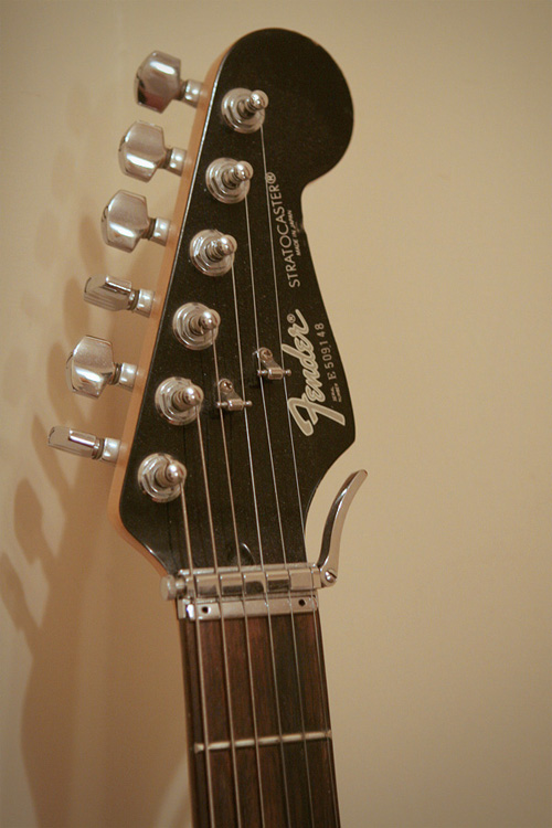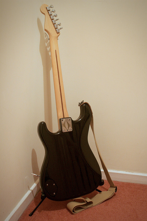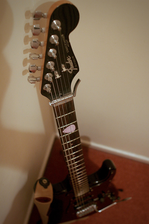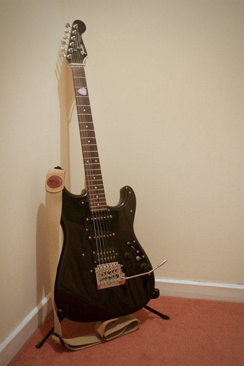 Here's my first guitar that I brought used from a local guitar shop. It's a modern looking strat with a utility belt full of cool features such as a TBX tone control which can add more treble frequency and a coil splitter to turn the humbucker into single coil. It's a really versatile guitar with loads of different tones available. This is the dark knight of stratocasters...